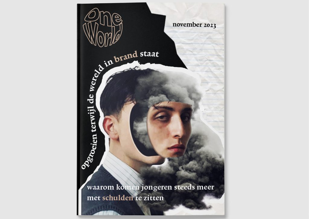 I was assigned an article ”Opgroeien terwijl de wereld in brand staat” (=Growing up while the world is on fire), for that article I designed a cover, opening spread, follow-up spread and a wordmark.