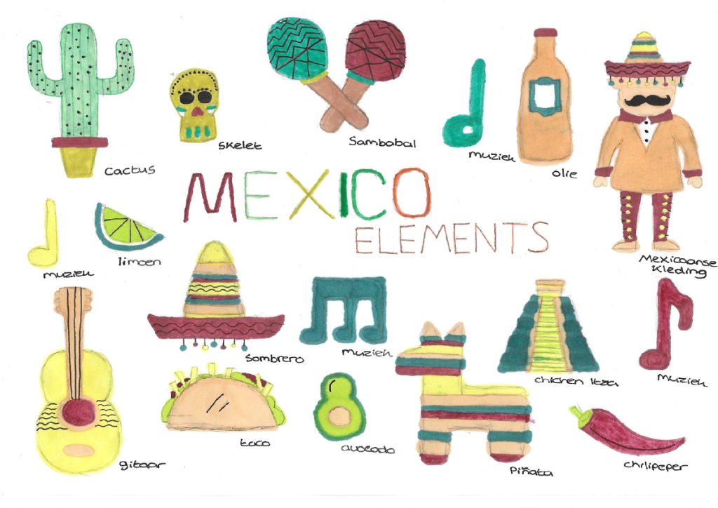 I started the project by making a mind map about the country (Mexico). I did this to get an overview of all my ideas and styles that fit with the country. This mind map helped me with the rest of the process.