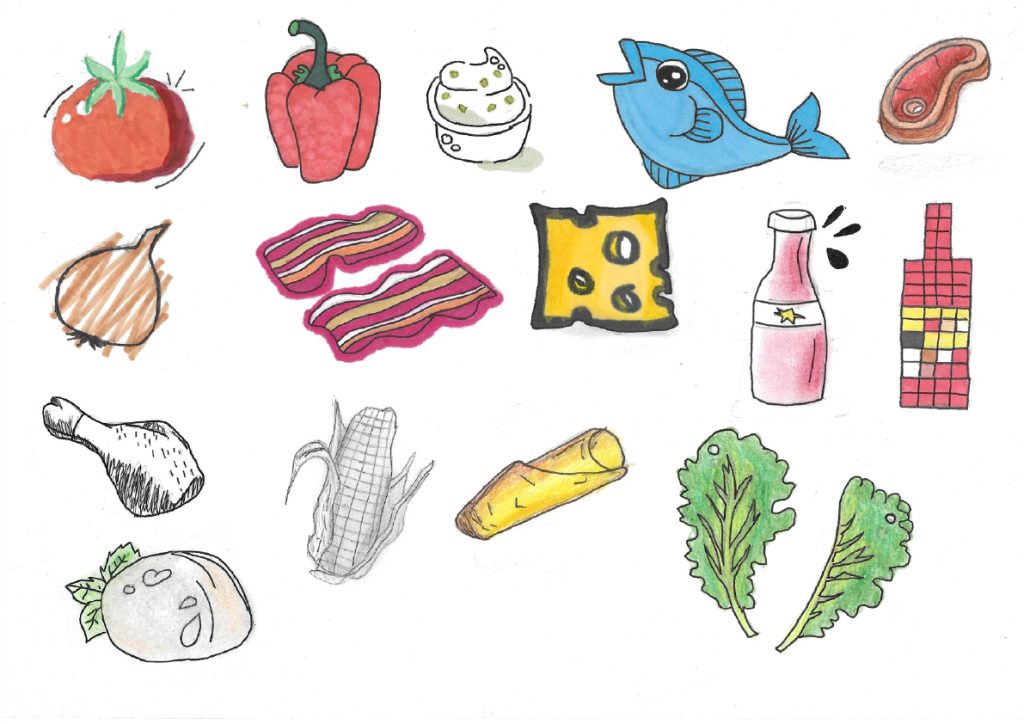 These are my final ingredients illustrations. I made the ingredients illustrations in round shapes and bright colors, because that fits well with the country of origin, I also used the style of the ingredients illustrations for the rest of my app prototype.